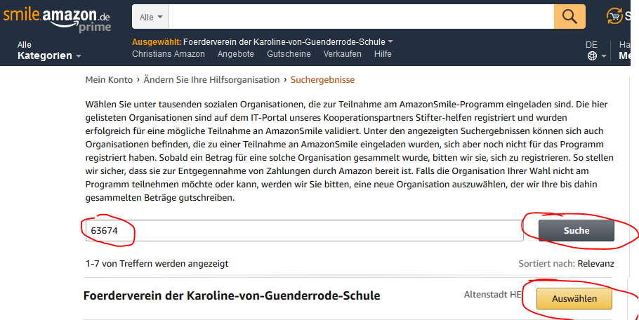 Bei Ihrem ersten Besuch bei smile.amazon.de müssen Sie eine Organisation auswählen. Suchen Sie einfach nach der PLZ 63674, dann finden Sie den Förderverein in der Trefferliste. Ihre Auswahl wird dann gespeichert.